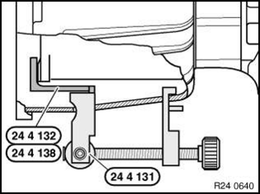 Install special tool 24 4 131 24 4 130 Locating Tool (basic unit) with corresponding blades in opening of transmission housing and clamp: