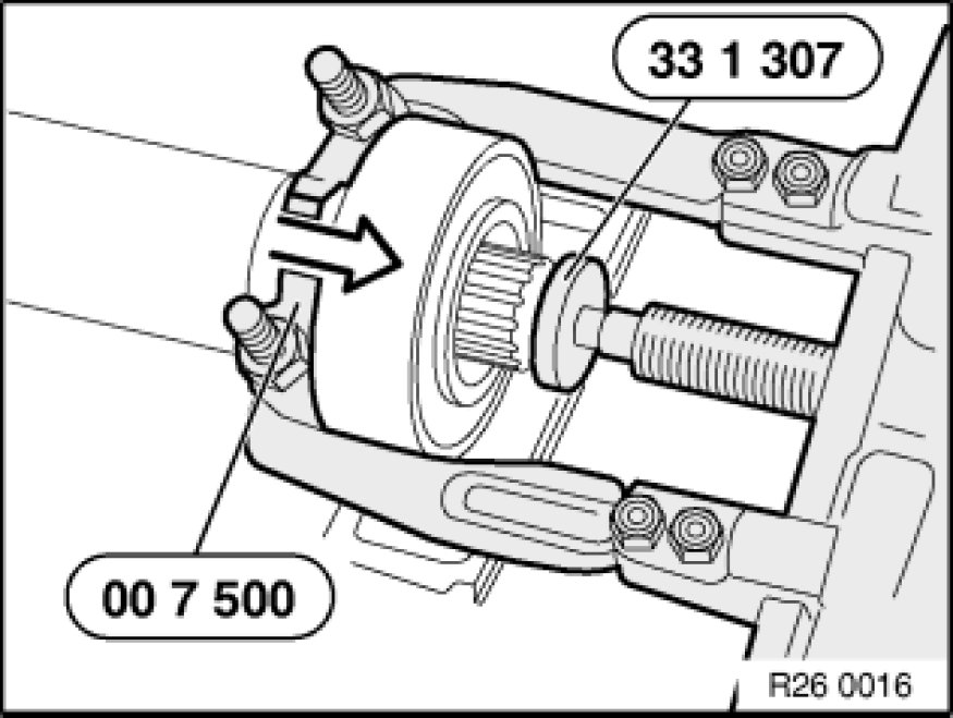 Pull off center bearing with special tool 00 7 500 00 7 500 Universal Puller Kukko 17/K / 33 1 307 and commercially available puller.
