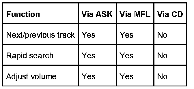 When the auto search button is pressed, the MFL transmits a status change to the control display. The control display identifies the currently active audio source and sends a telegram containing the request to the relevant control module. The functions can be: next track (drives), next station/channel (TV, radio).