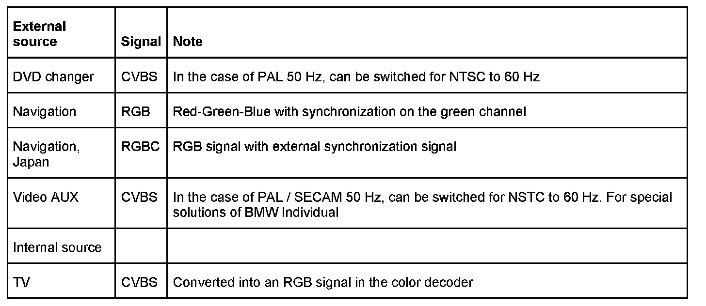 - With 'Rear Entertainment' equipment: TV picture and navigation displays can no longer be shown simultaneously on the Control Display. The navigation data is sent via RGB cable to the video module 5 Drive. The video module 5 Drive is unable to mix data. The data from the DVD changer or navigation system is duplicated in the video module 5 Drive. The duplicated data is distributed to the Control Display and the Rear Display. However, only one function can now be shown on one display.