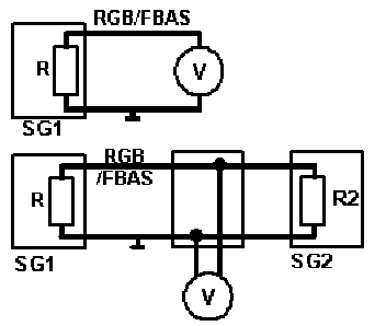 In the case of measurement without adapter, the second Control module (SG2) is disconnected. Upper circuit. For this measurement, the signal level is only measured via the resistance R. This is why a measurement without adapter leads to a double signal level.