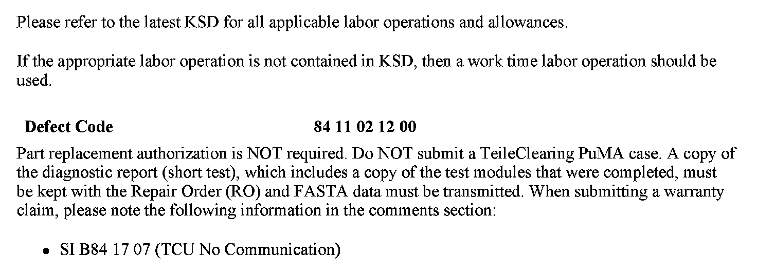 9. It is NOT necessary to obtain a Part Replacement Authorization (TeileClearing) for this specific issue. Refer to the Warranty section of this bulletin for more details. Additional information can be found in SI B84 23 05 (Enhanced Support for BMW Assist Telematics Control Unit [TCU] with Bluetooth & CPT9000 Phone Systems).