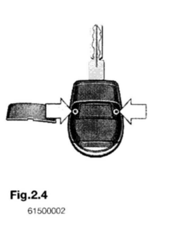 Radio transmitter keys on vehicles before model year 2000 require battery replacement every Inspection or when the message REMOTE KEY BATTERY appears in the check control display. Use a screw driver to lift the cover at the recess as shown in figure 2.3. Loosen the two screws shown in figure 2.4 and remove the cover. The battery type and position of installation are indicated on the back of the cover.