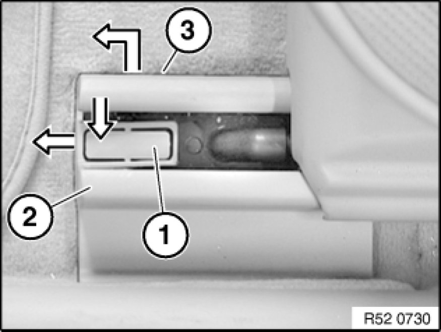 Press rocker switch (1) on front left seat rail cover and unlock.