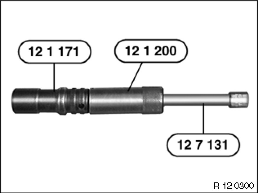 Tighten down spark plug with special tool 12 1 171 12 1 170 Spark Plug Tool and special tool 12 7 131 12 7 130 3/8" Extension Piece (2) (extension), special tool 12 1 200 12 1 200 Torque Limiter 30 Nm (torque limiter).