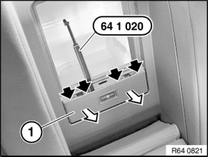 Carefully lever out cover (1) with special tool 64 1 020 64 1 020 Release Hook at marked areas.