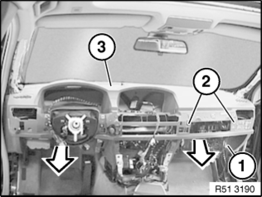 Pull off instrument panel (3) in direction of arrow and lift out to right front door.