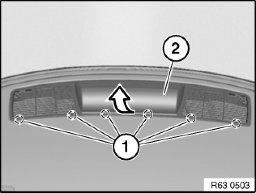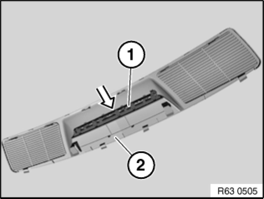 Fold up complete ventilation louver for oddments tray (2) in direction of arrow, disconnect plug connection underneath and remove complete ventilation louver for oddments tray (2) towards front.