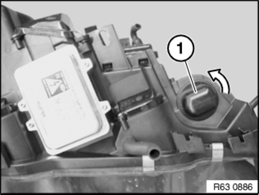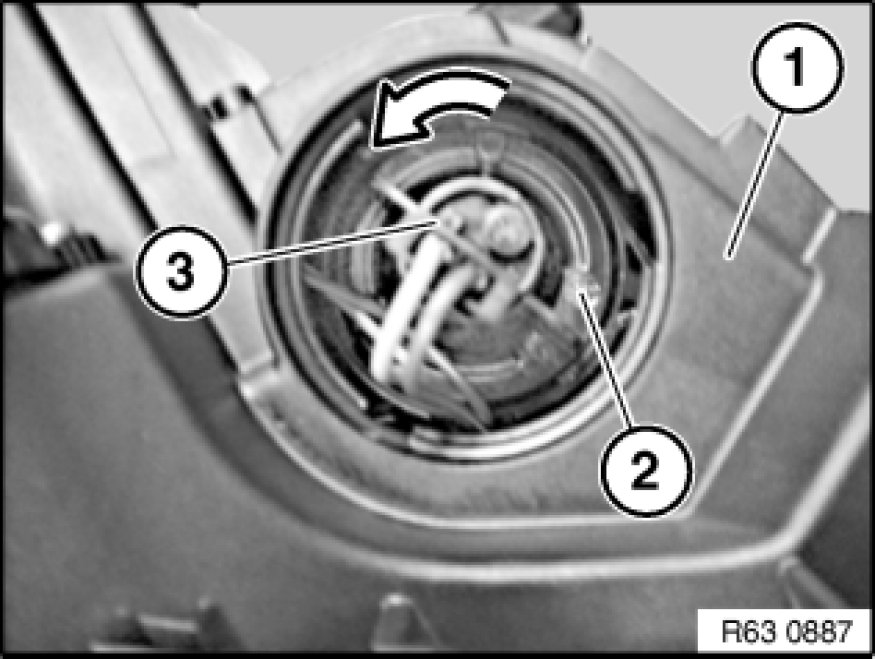Turn bulb (2) in direction of arrow and remove from headlight (1).