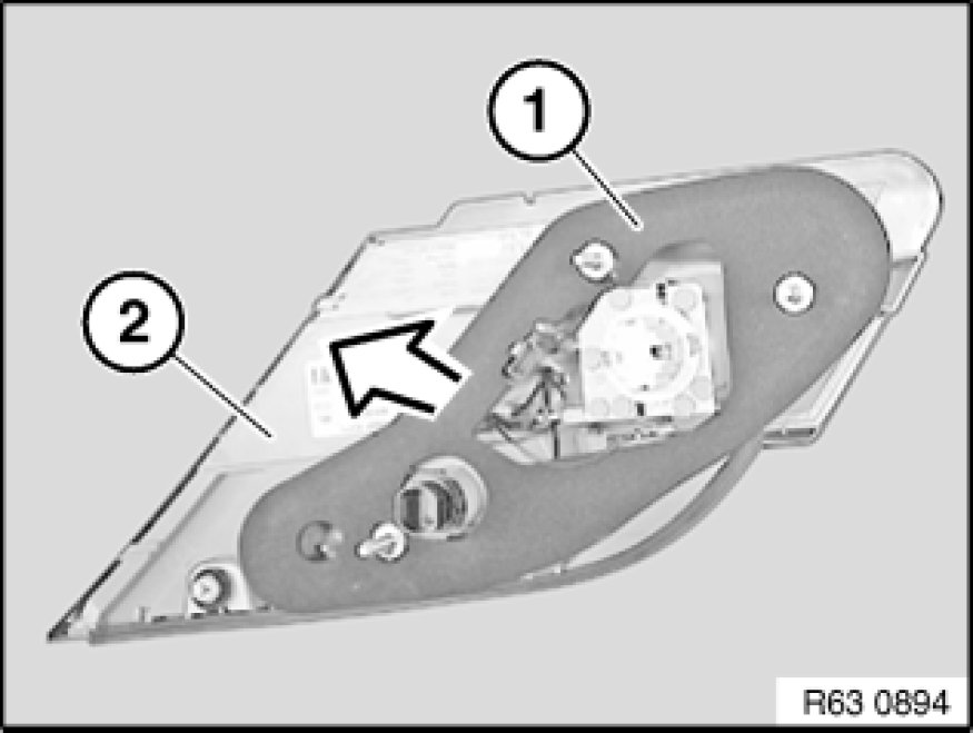 Make sure sealing frame (1) is correctly bonded all round on rear light (2).