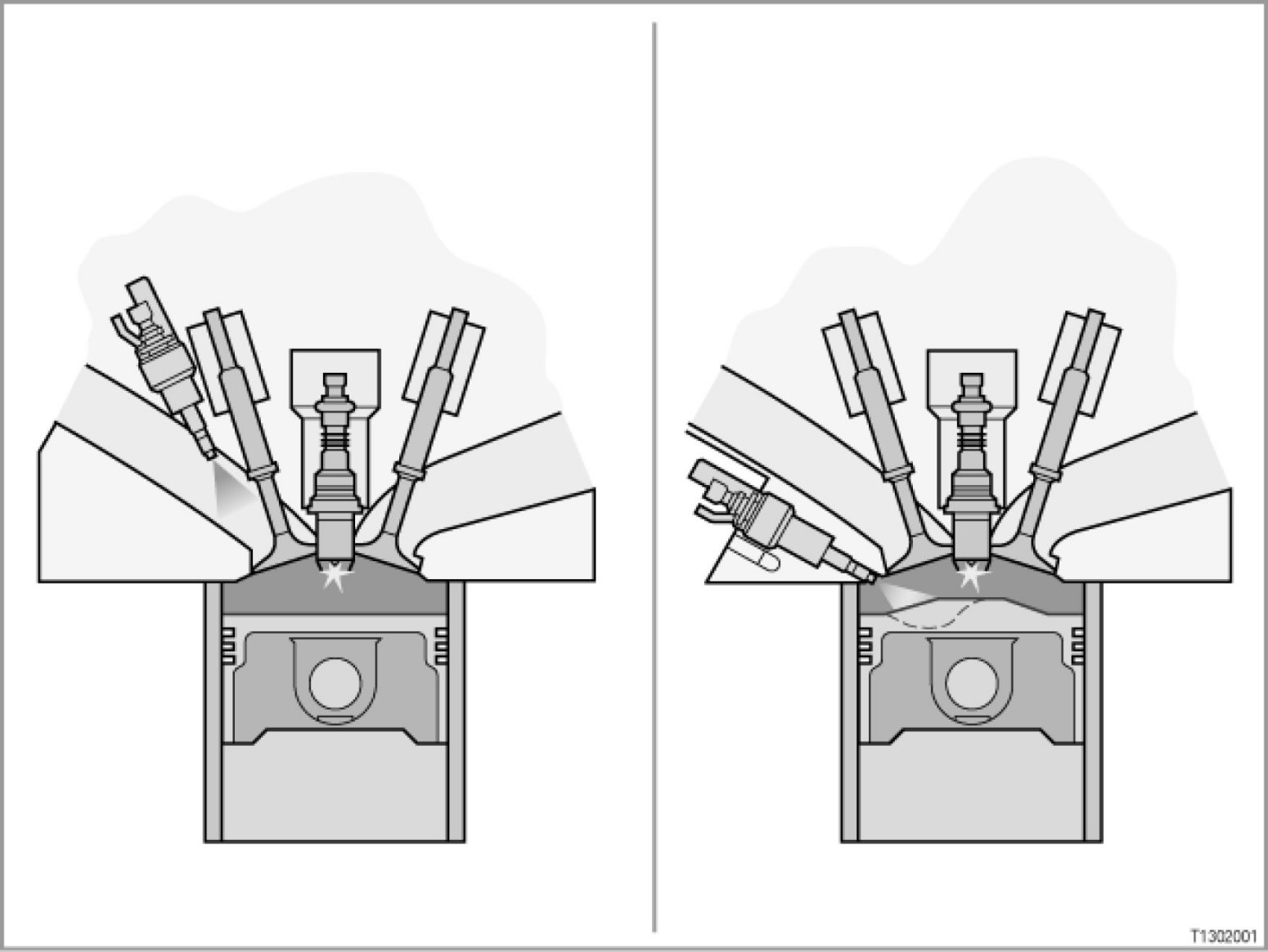 The use of direct injection without lean running creates a homogenous mixture in the entire combustion chamber. A homogenous mixture means that the fuel-air ratio is stoichiometrically controlled in the same way as it is in manifold injection systems (Lambda = 1)