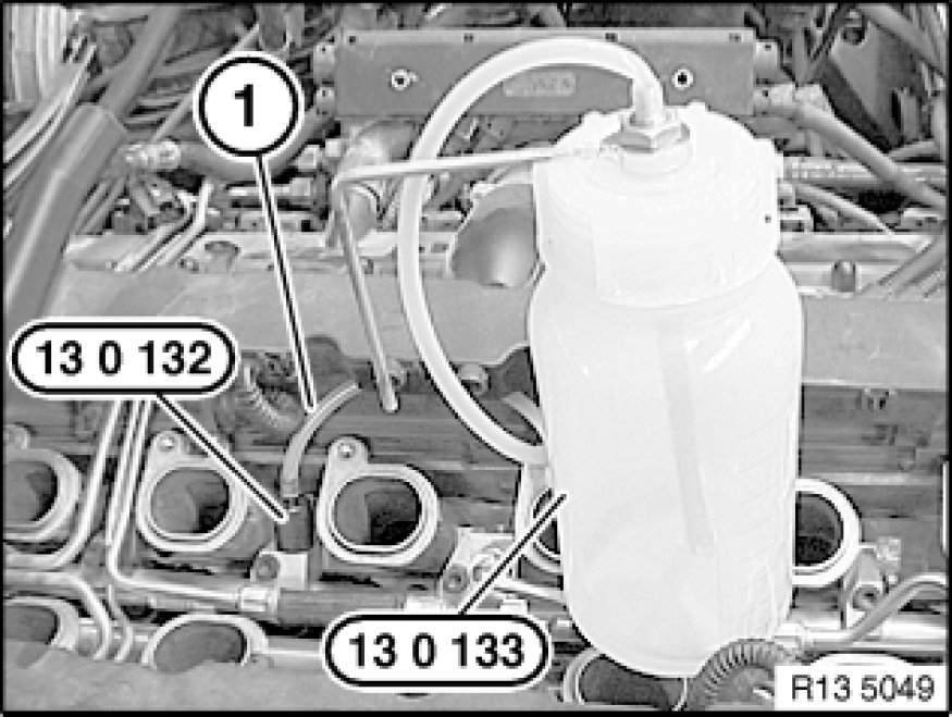 Connect special tool 13 0 133 drain tube (1) to special tool 13 0 132.
