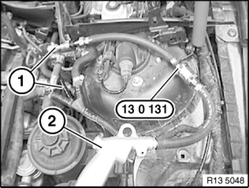 Connect special tool 13 0 131 to fuel feed line (1).