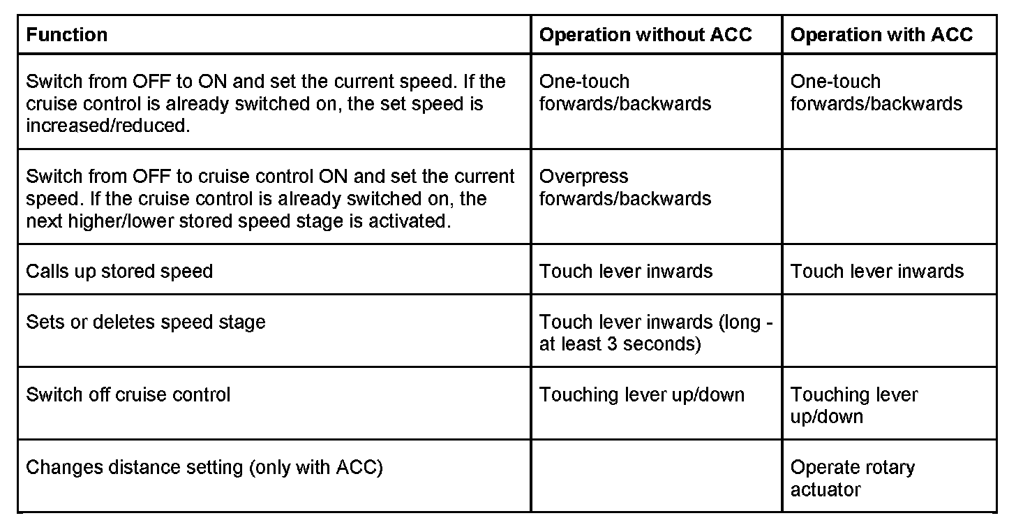 The steering-column lever for cruise control increases or reduces the traveling speed.