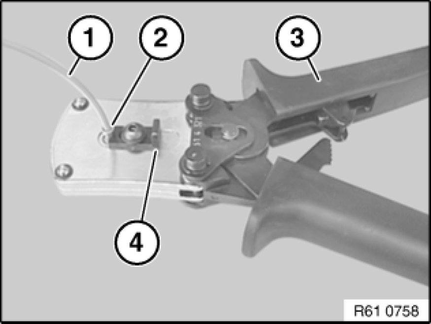 To crimp optical fibers, use pliers 61 4 321 (1) in conjunction with crimping head 61 4 323 (2) from crimping set 61 4 320 61 4 320 Crimping Set with Pliers.