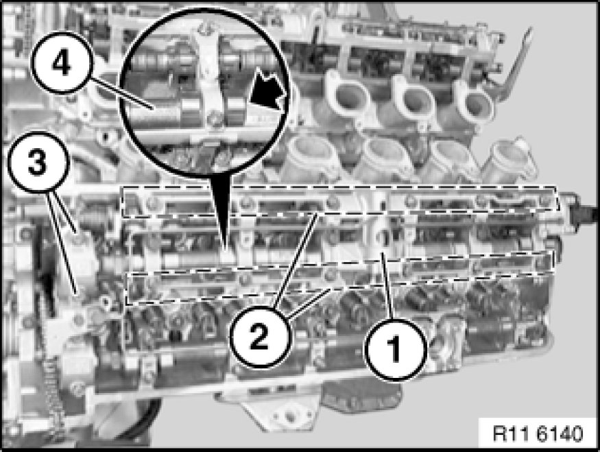 Fit preassembled bearing bracket (1) carefully on cylinder head inlet valves.