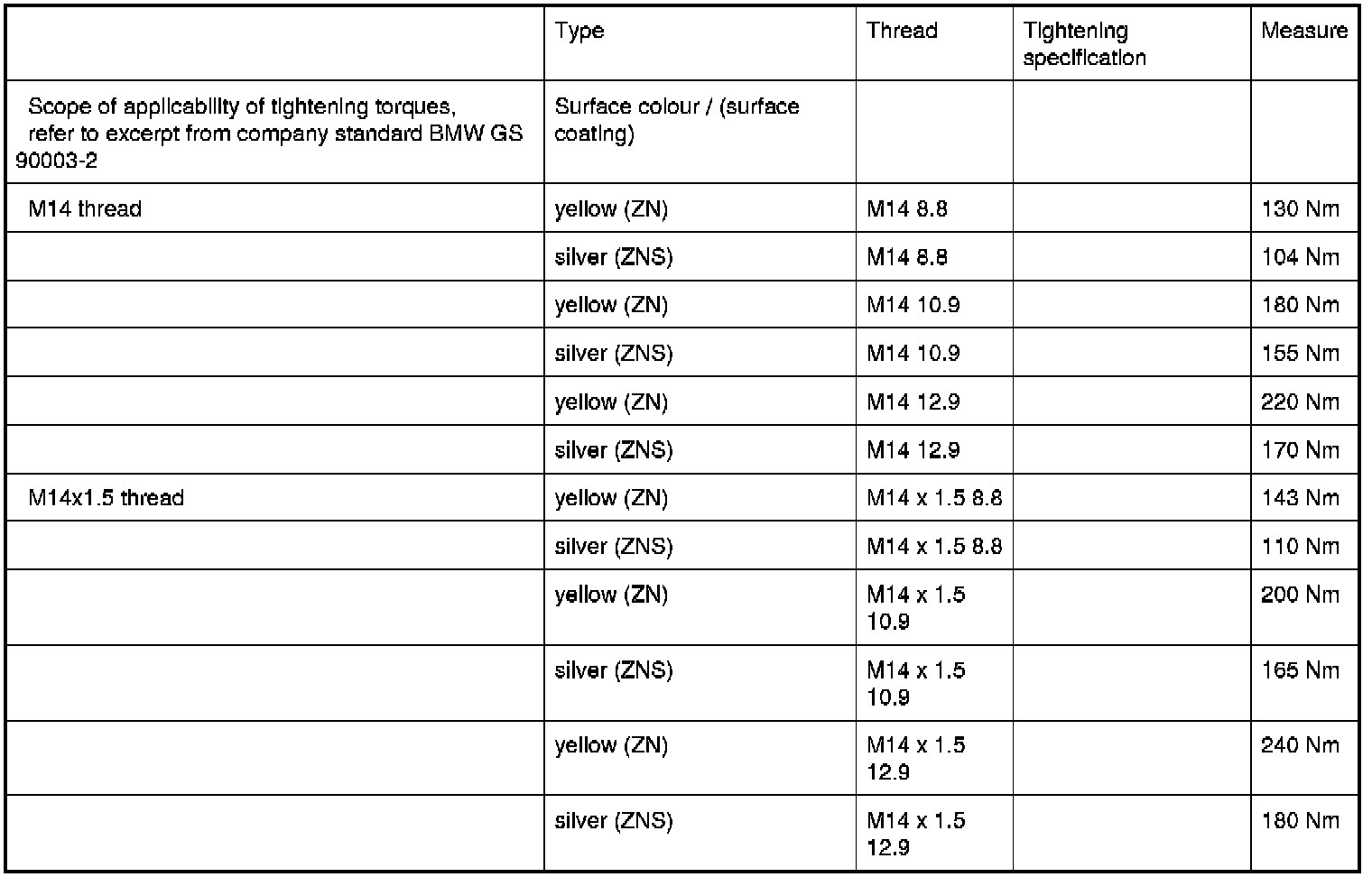 M14 and M14x1.5 - Maximum Tightening Torques Acc. to BMW GS 90003-2