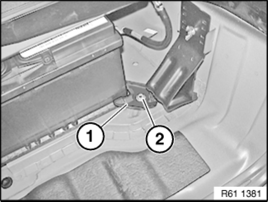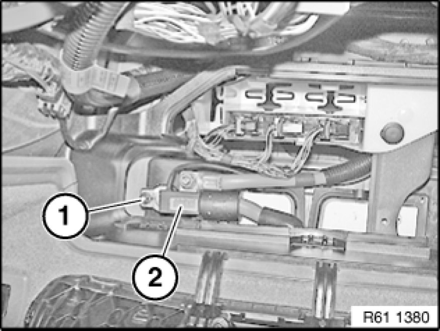 Detach safety battery terminal (2) towards top, lay to one side and secure.