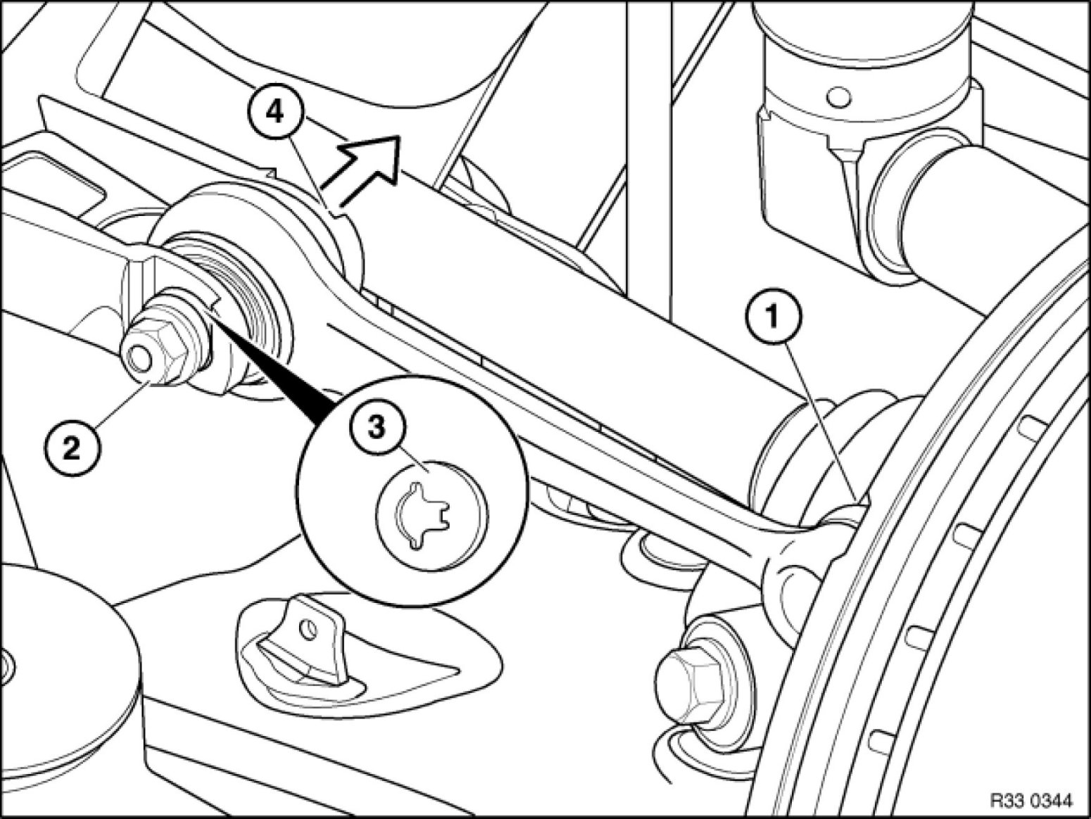 If during removal operations the guide arm is detached from the rear axle carrier, it is necessary after reinstallation to carry out a wheel/chassis alignment check.