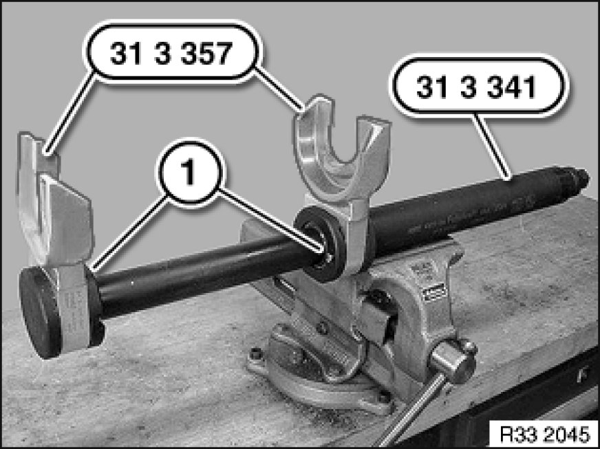 Fit special tools 31 3 357 31 3 350 Spring Holder from above on special tool 31 3 341 31 3 340 Spring Tensioner until locking pins (1) can be felt and heard to snap into place.
