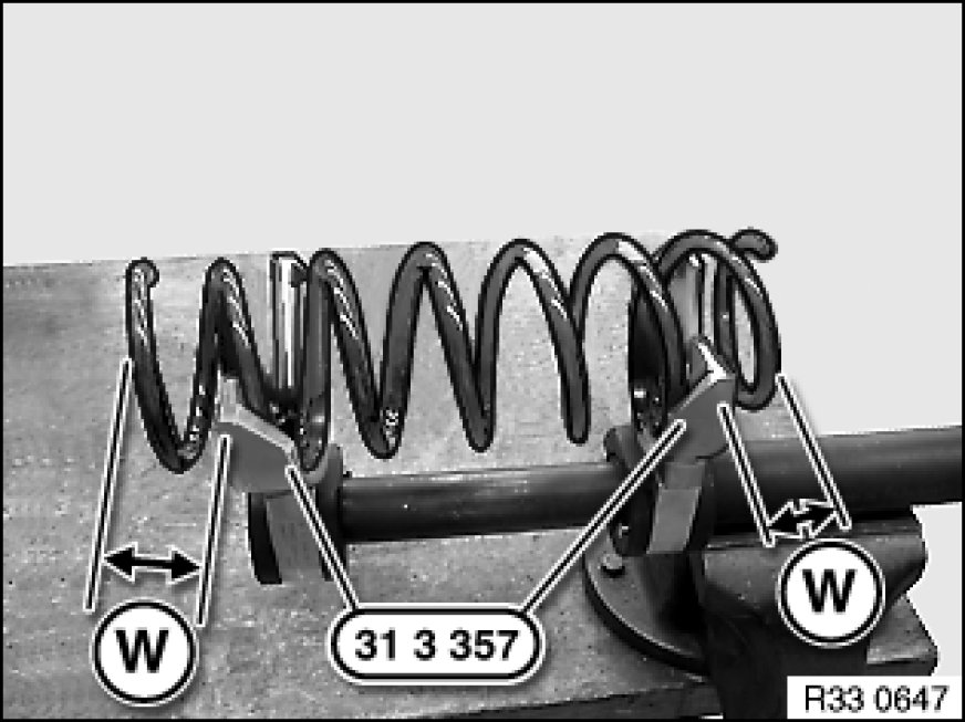 Accommodate coil spring with special tools 31 3 357 31 3 350 Spring Holder in such a way that both ends of coil spring are approx. one coil (W) outside special tools 31 3 357 31 3 350 Spring Holder.