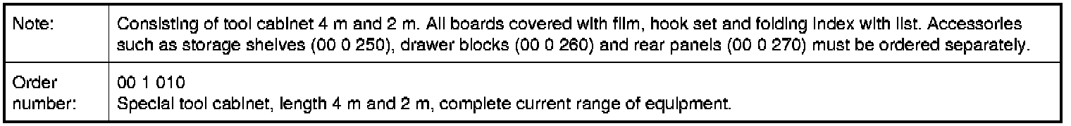 00 1 010 Special tool cabinet, length 4 m and 2 m, complete current range of equipment.