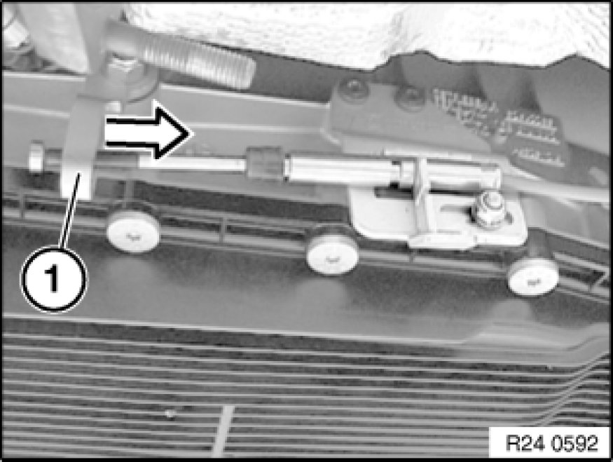 2. Use the strap 1 to pull out the release lever, continuing until it snaps into place - the transmission lockout is released.