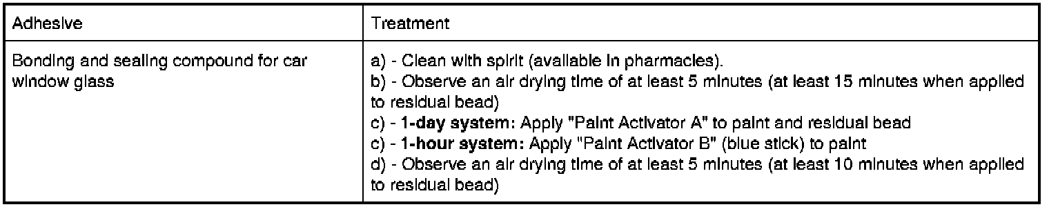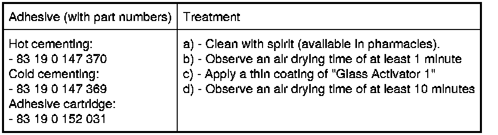 The windshield and rear window (also the rear side windows if necessary) are bonded to the body. This gluing will increase the torsional strength of the vehicle. To obtain perfect bonding, comply with the installation procedure described in the following.