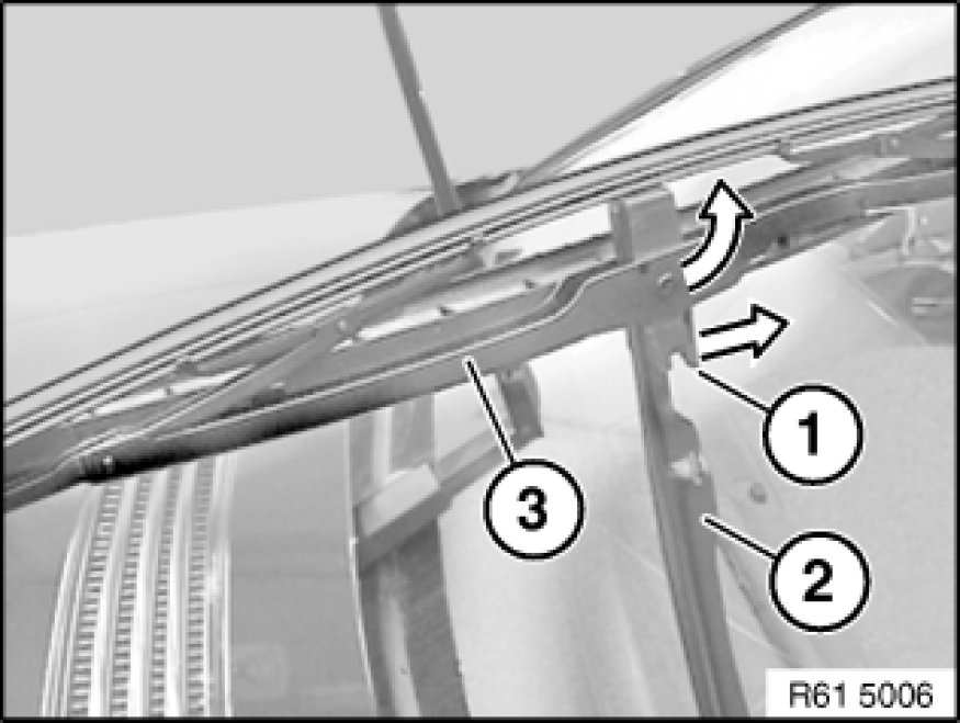Press locking spring (1) in direction of arrow. Remove wiper blade (3) in direction of arrow from wiper arm (2).