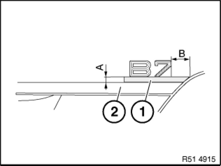 Stick on top edge of adhesive tape (1) parallel to trim (2) on rear lid at distance (A).