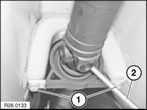 Using a suitable tool (2), secure propeller shaft at centre universal joint against turning.