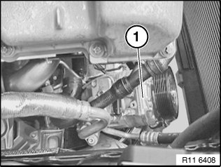Release air-conditioning compressor (1) and set down on front axle carrier.