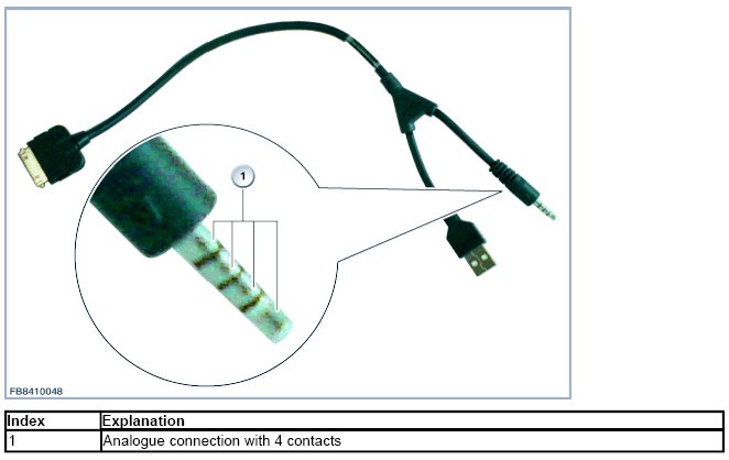 The MINI Y-cable has a connection for the Apple terminal device and a USB port and a 4-pin analog jack plug. The data exchange and the audio signals are transmitted via the USB port. The video signal is output analogously via the jack plug. From production date 03/11 the stereo-audio signal is also transmitted analogously via the jack plug.