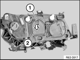 Unlock retaining clip (1) and remove protective cap (2) in direction of arrow from headlight.