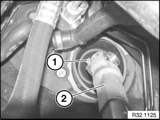 Remove oil reservoir (3) with bracket from combination bracket, pass under vacuum line (1) and place to one side.