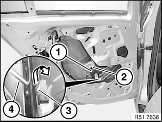 IMPORTANT: Disconnect plug connection (1) from power window motor (2) (risk of trapping).