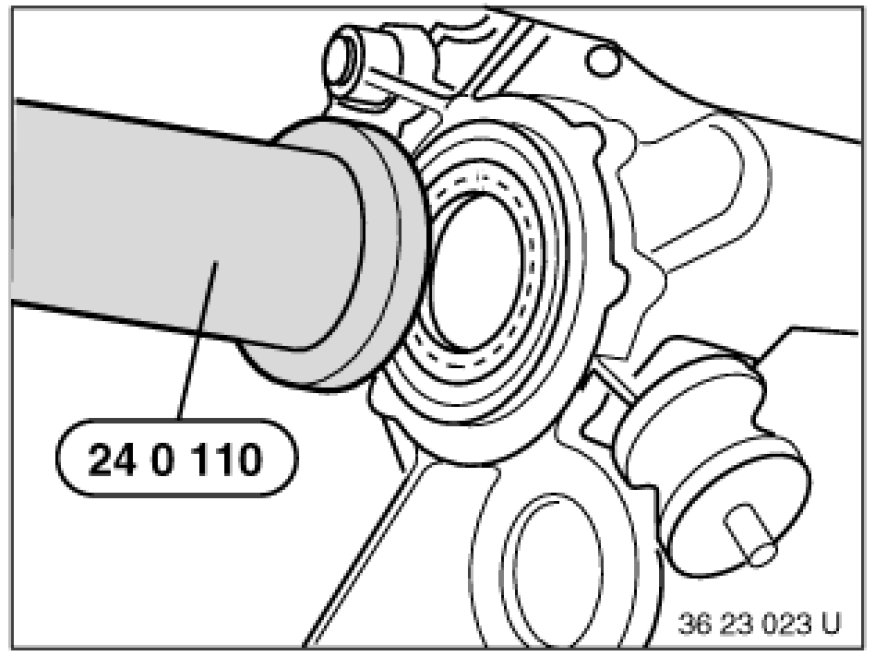 Drive in radial shaft seal with special tool 24 0 110 24 0 110 Drift and plastic hammer until flush.
