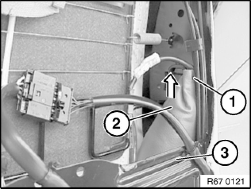 Cut through cable tie (1) on jacket of drive unit for lumbar support (2).