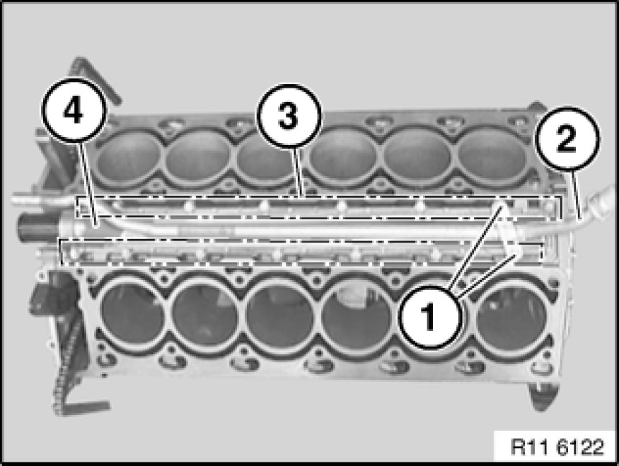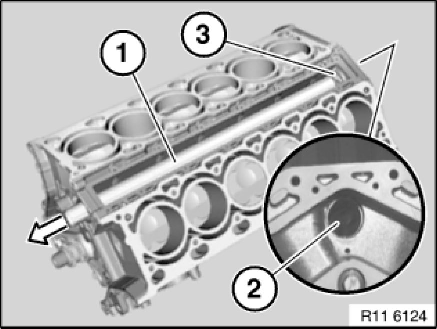 Drive out coolant pipe (1) with special tool 23 1 040 at cutout (2) towards front.