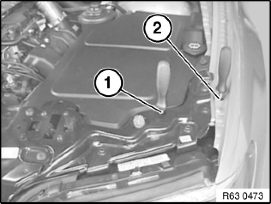 Carry out headlight adjustment at adjusting screws below openings (1) and (2).