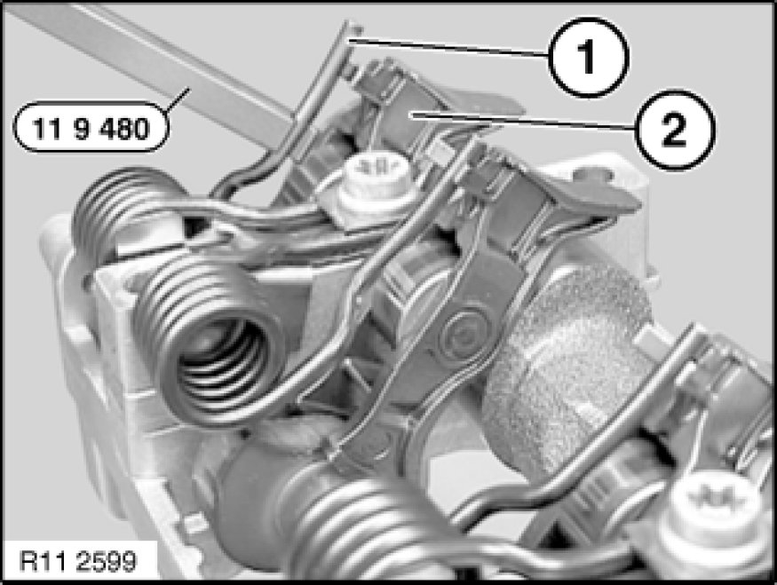 Support end of torsion spring protected with special tool 11 9 490 11 9 490 Holding Sleeve on inlet camshaft.
