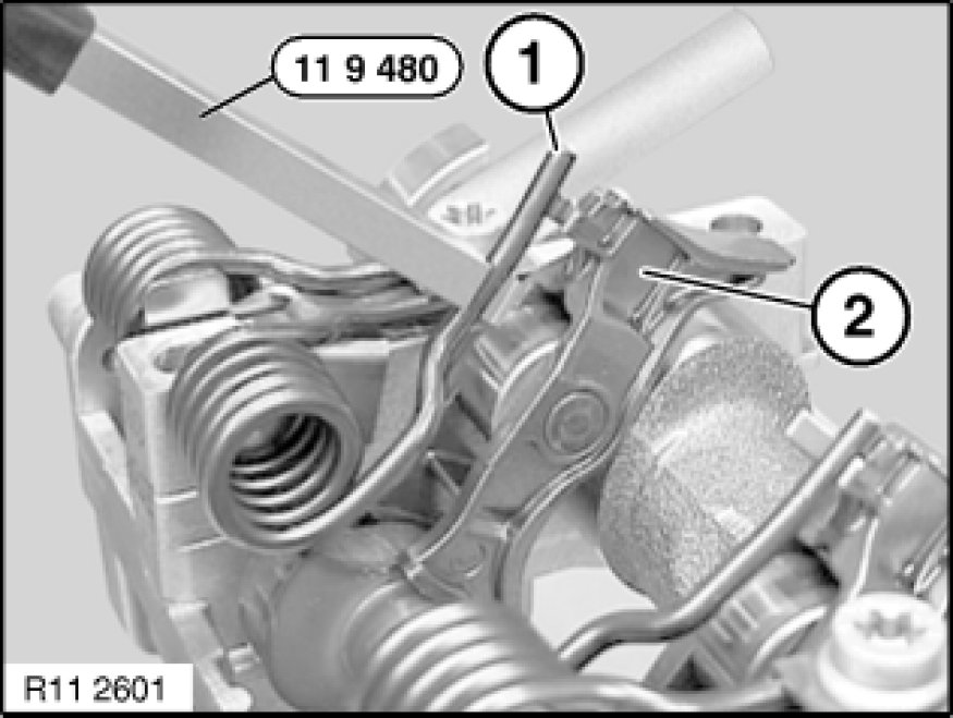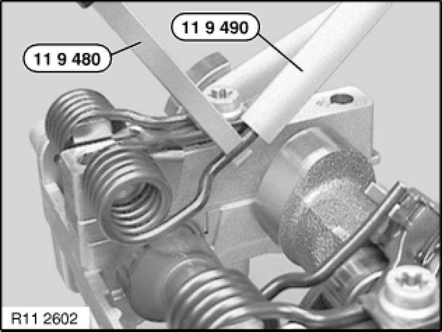 Raise torsion spring on second side with special tool 11 9 480 11 9 480 Lever, remove intermediate lever upwards and secure with special tool 11 9 490 11 9 490 Holding Sleeve.