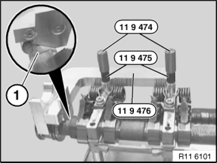 Fit inlet camshaft (1) with special tool 11 9 476 11 9 470 Support and adjust, secure with special tool 11 9 475 11 9 470 Support.