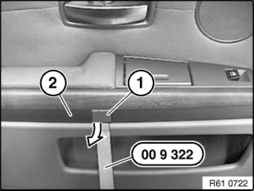 To prevent damage to armrest pad: insert rear power window switch (1) guided by special tool 00 9 341 into armrest on rear door (2).