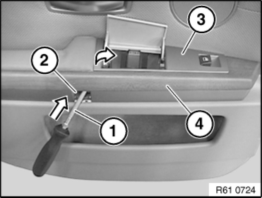 Using a suitable tool (1), press power window switch (3) through opening (2) out of armrest on rear door (4).