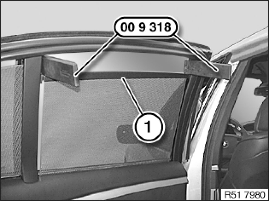 - Retract roller sun blind (1) and block at pull rod with special tool 00 9 318 00 9 318 Multipurpose Wedge at bottom (left and right sliding members snap out)