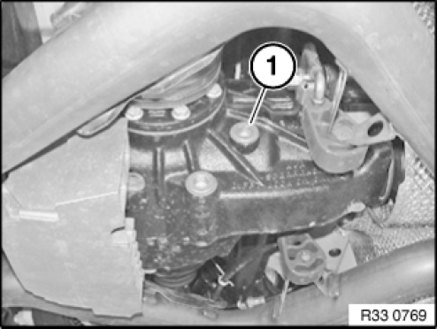 If necessary, pour in final drive oil up to lower edge of opening for oil filler plug (1).
