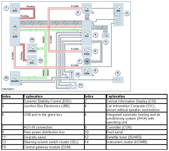 In the rear passenger compartment, there are 2 folding rear monitors, each with 800 x 480 pixel resolution as well as an infrared transmitter unit (SA6FG or SA6FH). The rear monitors are integrated in the backrests of the front seats. On both versions, the control unit (RSE) is integrated for the first time in the MOST bus. The Car Information Computer (CIC) serves as the master control unit for the MOST bus.