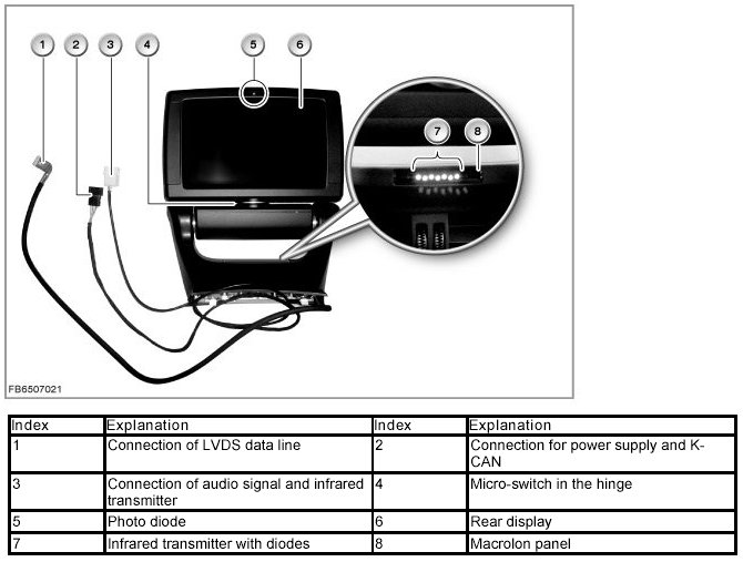 The rear display serves as the display unit for the RSE control unit. The picture signals are transferred across an LVDS data line from the RSE control unit to the rear display.