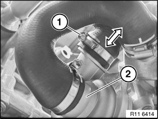 Detach coolant hose of feed line in direction of arrow from coolant pump (2).